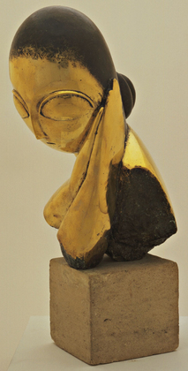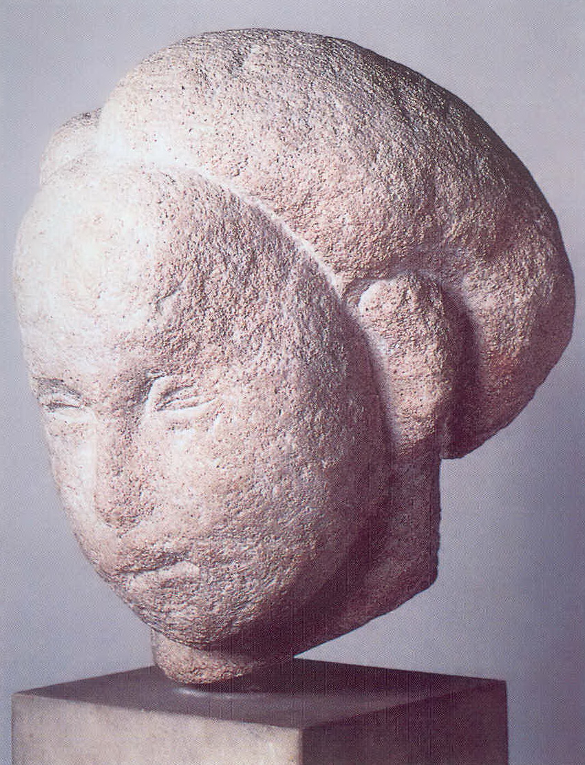 1908 tarihli kumtaşı heykelin adı olan Danaide (Resim.5), Yunan Mitolojisi’nde, Argos Kralı Danaos’un elli kızına gönderme yapar. Amcaoğulları ile evlendirilen elli Danaide’in biri dışında hepsi, babalarının öğüdünü dinleyerek düğün gecesi kocalarını öldürür ve tanrılar tarafından ölüler ülkesi Hades’te dibi delik bir fıçıyı sonsuza dek doldurmakla cezalandırılırlar.[8] Kocasını öldürmeyi reddeden Danaide ise erdemin sembolü ve Brancusi’nin esin kaynağı olur. Heykelde gördüğümüz taştan çıkan genç kız figürü başını hafifçe öne doğru eğmiştir. Kuvvetli bir alna sahip oval yüzü, açık bir yara gibi acı çeken gözleri, belirsizce aralanmış ağzı ve ensenin arkasında kısa kesilmiş saçlarıyla, mitolojik anlatıya uygun olarak; kaderi, suçunun bedelini ödemek için gösterdiği sonu gelmez çabayı, sonsuza dek sürecek şiddetli pişmanlığı görselleştirir.
